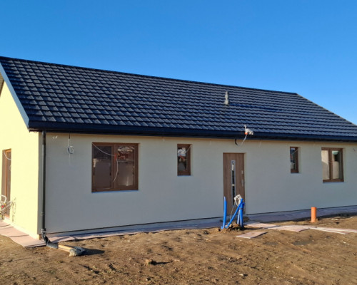 Budynek wykonany z pustaka, ocieplony styropianem 8 cm. Dach dwuspadowy